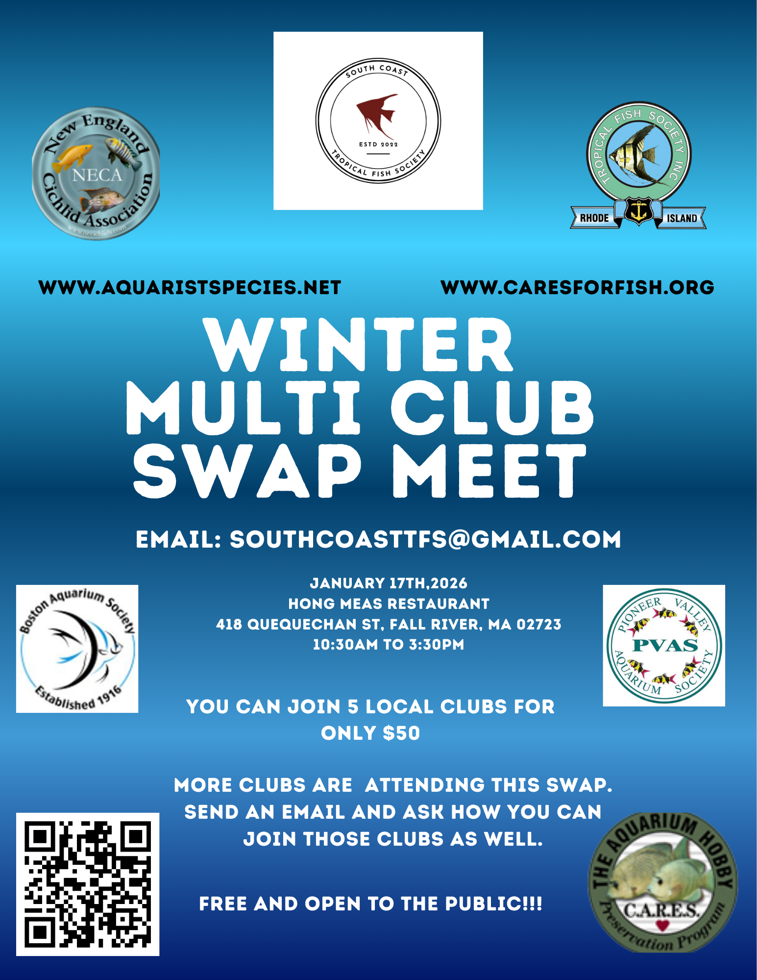 Come join other BAS members as well as members of four+ other regional aquarium clubs next weekend, January 17 at Hong Meas restaurant in Fall River. We've participated in this multi-club meet for a few years running, and it is always one of the largest gatherings in the area. If you're planning on attending, get there early--many of the best items to buy or swap go fast.